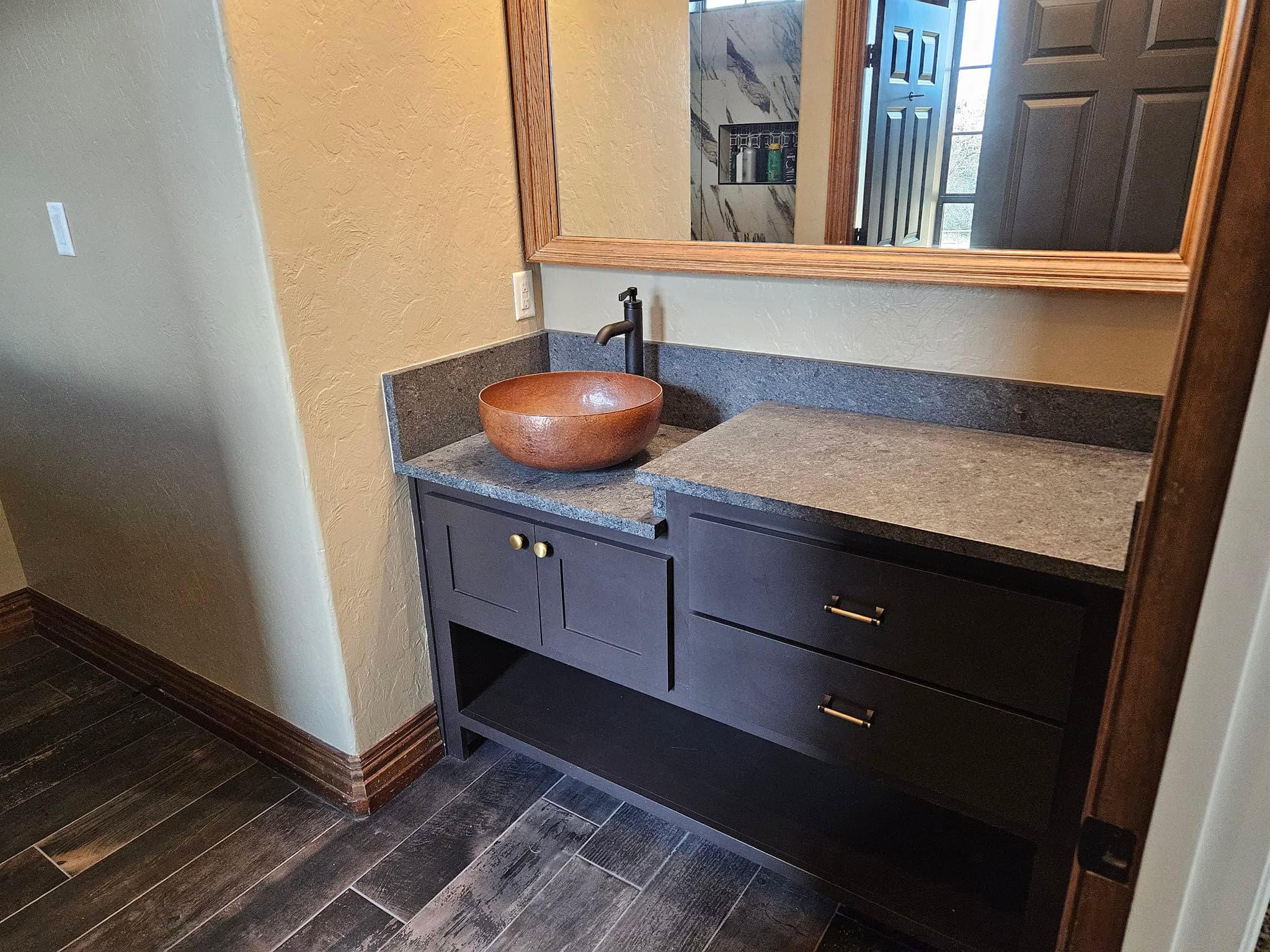 We work with granite, selecting the finest slabs for lasting bathroom surfaces.